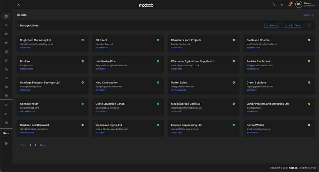 moobob’s Client Management system is designed to enhance your business relationships and streamline client interactions. It offers a centralised platform to store and access comprehensive client information, including contact details, communication history, and preferences. This enables personalised service and tailored communication, fostering stronger client relationships and increased satisfaction.